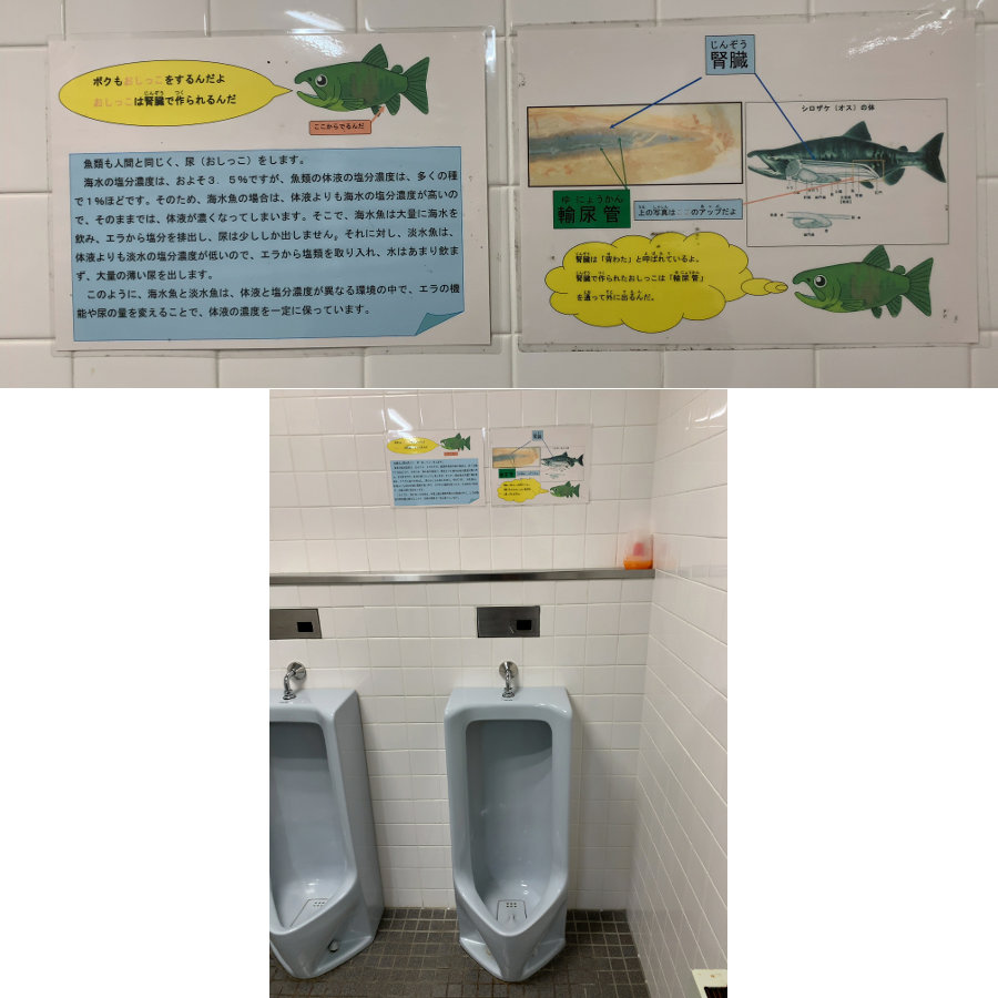 一通り見て回って、最後にドレンを抜きに便所へ寄ると、そこにもサケについてお勉強になる掲示が。
