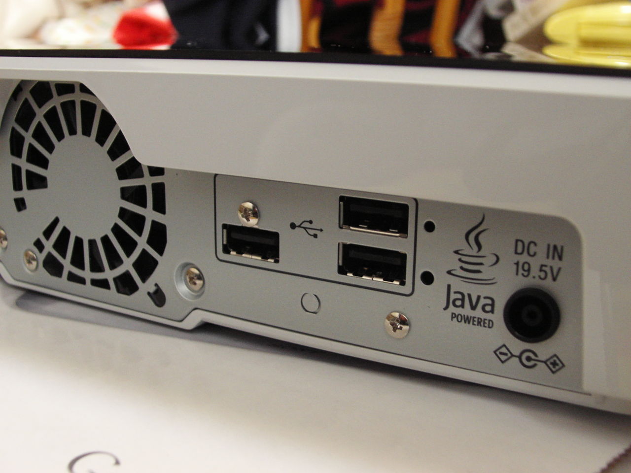 (背面正面右手側:排熱ファン、USB x 3、電源ACアダプター)