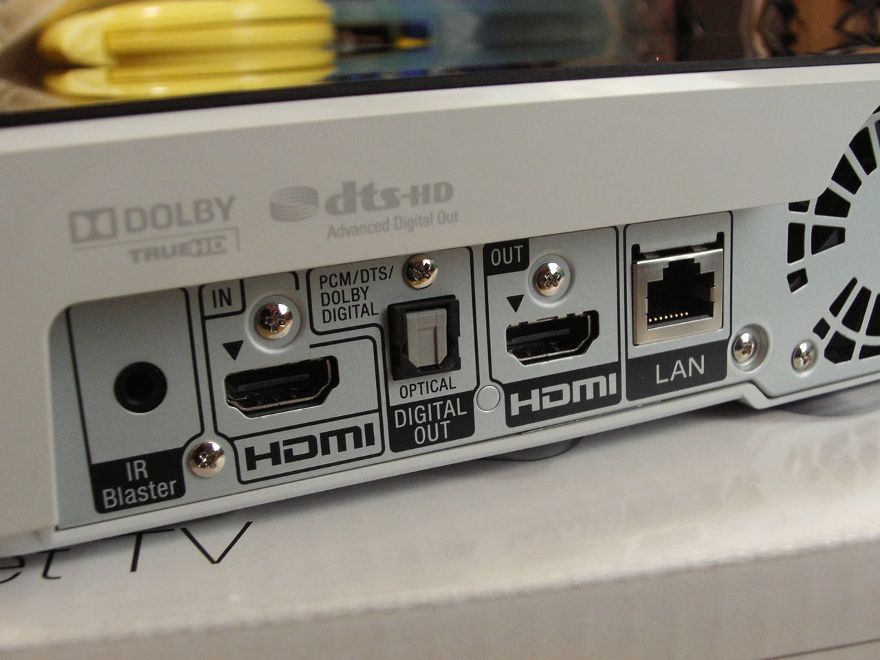 (배면 정면 왼손측:IR Blaster, HDMI의 입출력, 오디오 포토, LAN(Wi-Fi에도 대응))