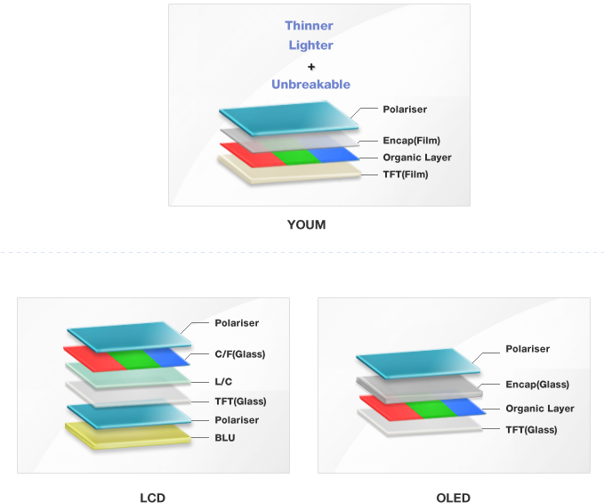 이름 외에도 삼성 웹사이트는 이 기술과 LCD, 그리고 OLED 사이의 대조를 제공하고 있다. 특히 표준 OLED와 플렉서블 AMOLED 디스플레이의 유일한 차이는 유리 대신에 필름을 사용하는 것이고, 이는 디스플레이를 더 얇고 깨지지 않게 만든다.