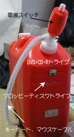 前のバージョンでは、ポリタンクの後ろを輪切りにしてしまったが、今回は必要最小限にとどめた。 前面では、フロッピーなどは3.5インチベイに入れることとしたため、3.5インチベイ用の部分を開けた。扉は、完全に切り取らずに残った部分がヒンジになるようにした。 使いやすさを考え、前面にI/Oポート(USB,IEEE1394,Audio)を作った。 また、外見をよくするために、できるだけポリタンク材料以外(特にCDドライブのふたの蝶番)が見えないようにした。
