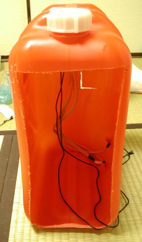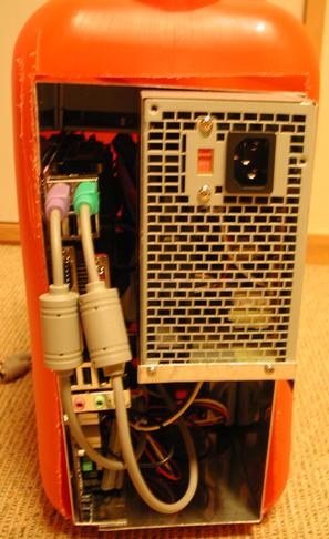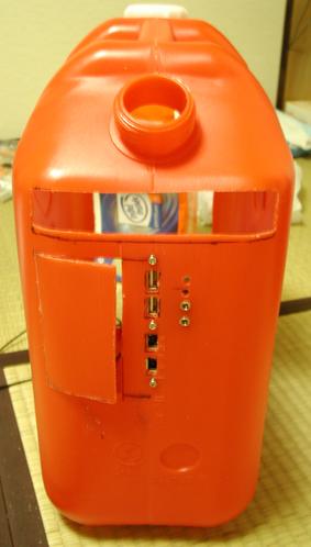 前のバージョンでは、ポリタンクの後ろを輪切りにしてしまったが、今回は必要最小限にとどめた。 前面では、フロッピーなどは3.5インチベイに入れることとしたため、3.5インチベイ用の部分を開けた。扉は、完全に切り取らずに残った部分がヒンジになるようにした。 使いやすさを考え、前面にI/Oポート(USB,IEEE1394,Audio)を作った。 また、外見をよくするために、できるだけポリタンク材料以外(特にCDドライブのふたの蝶番)が見えないようにした。
