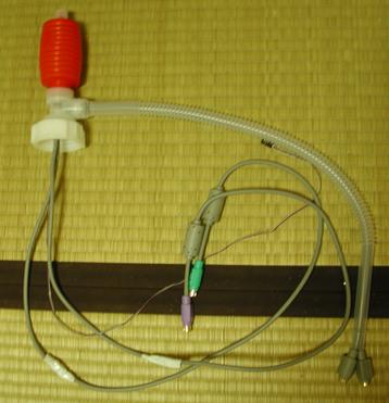 신형의 펌프 스윗치에 키보드와 마우스의 연장 케이블을 통해 완성 연장 케이블은 그대로는 통하지 않기 때문에, 일단 자르고 나서 통하고, 또 이었다.