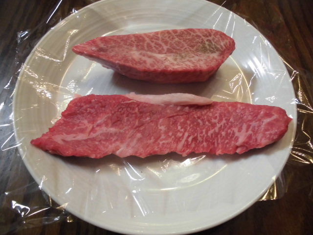 写真以下2枚。今日の、夕食の、メイン(main)料理の、ステーキ(beef steak)の食材の牛肉で、何れも、国産(日本産)の、黒毛和牛(日本原産の高級牛肉)と牛肉の交配の牛肉のステーキ(beefsteak)肉で、ミスジ(牛の肩甲骨の内側の肉。濃厚な味で、柔らかい)(皿の上側)(123g程)と、トモサンカク(股肉(もも肉)の中で、一番、霜降り(サシ)が入る部位。赤身とサシ(脂身)のバランスが良い)(皿の下側)(121g程)です。2枚、合わせて、245g弱(244g)程。私としては、少な目の、肉の量です。とても、美味しかったです。