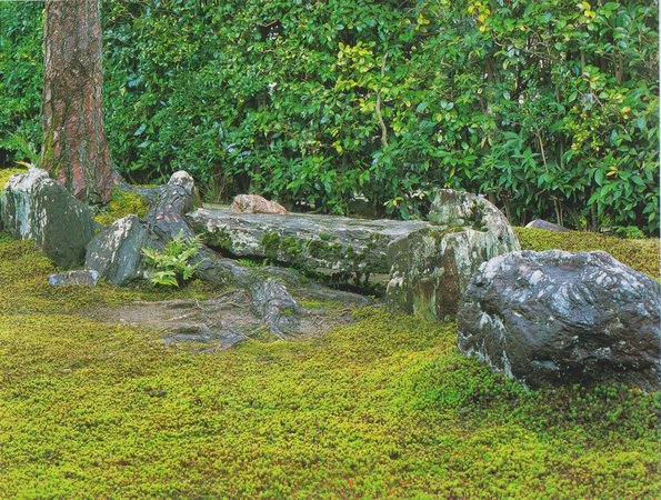 あらかじめ色んな本を見てこの庭を頭に描いていたのだが、実際に見てみると、想像とかなり違っていた。写真では、上のように、庭の奥に低平な石組が並んでいるだけにしか見えないが、1つ1つの石が明るく、形も良くて、庭から発せられるエネルギーを強く感じることが出来た。