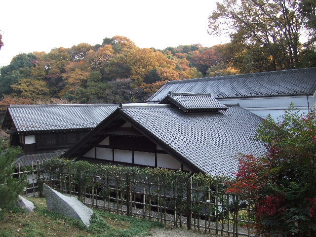 紅葉と、移築された日本の古い農家(農民の家)の屋根。