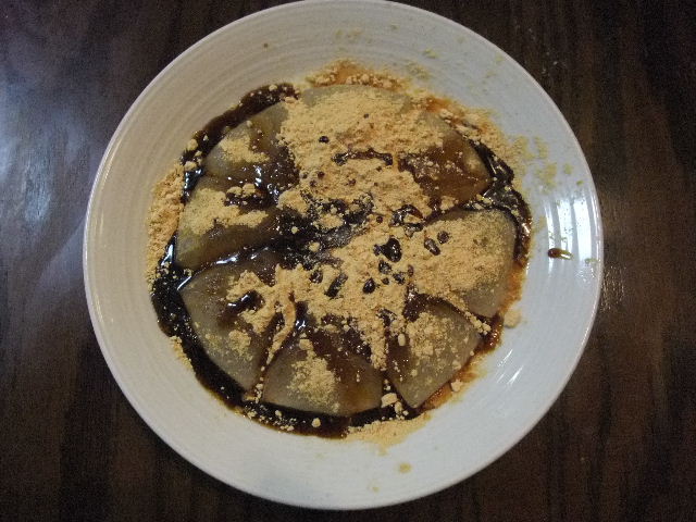 写真以下5枚。一昨日の夕食の、デザート(dessert)として、食べた、くず(kuzu)餅(二人分)。