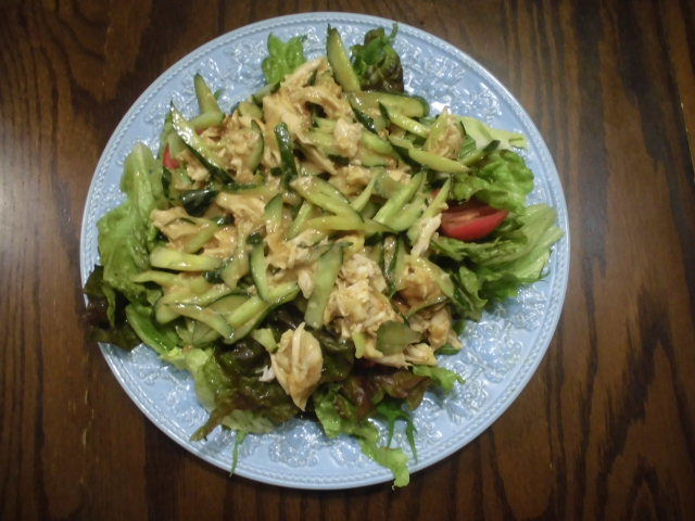野菜サラダ(salad)、棒棒鶏(bang bang chicken)載せ。