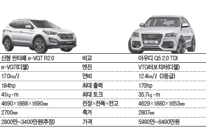 실제 신형 싼타페(2.0 기준)는 엔진 성능 개선을 통해 Q5에 비해 연비는 ℓ당 4.6㎞, 최대 출력은 14마력, 최대 토크는 5.3㎏ㆍm가량 우수하다. 또한 전장(전체 길이)은 61㎜, 전폭(좌우 폭)은 8㎜, 전고(높이)는 37㎜ 더 길다. 가격도 Q5(2.0 기준)가 5990만~6490만원인 데 비해, 신형 싼타페(2.0 기준)는 2800만~3400만원(추정치)으로 거의 절반에 불과하다. 블루링크를 비롯한 각종 편의장치가 대거 적용된 것도 싼타페의 경쟁력이다.
