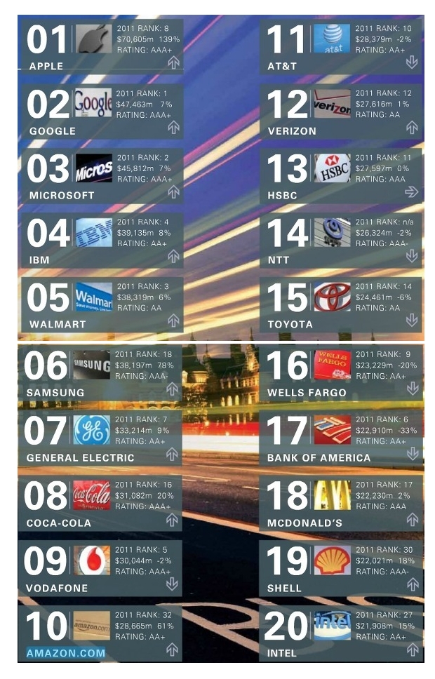 브랜드 파이낸스에서 새롭게 발표한 2012년 글로벌기업 브랜드가치 순위