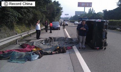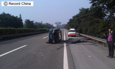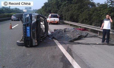 11日、四川省瀘州市の高速道路を走行中のピックアップトラックが横転し、車内から袋詰めにされた16体の遺体が発見された問題で、遺体は医大に運ばれる途中の教材用標本だったことが判明した。写真は事故現場。