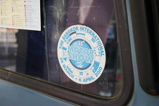 2010年のバンコクモーターショーのステッカー。日の丸は、星条旗の左なのですが、赤色がほとんど抜けてしまって白旗になっていました。
