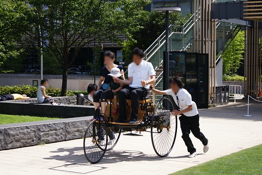 잔디 광장에서 실시하고 있던 「Patent-Motorwagen」의 주행 데먼스트레이션입니다.「Patent-Motorwagen」는, 1880년대에 개발된 최초의 가솔린 자동차입니다.성능은 최고 시속은 12 km/h와 아직도 비실용적.오르막에서 달리기 시작할 때 , 어느 정도 인력이 필요합니다.그렇다고 하는 것으로, 실용적인 자동차의 등장은, 1900년대의 Ford 「Model T」까지 기다리게 되므로 했다.