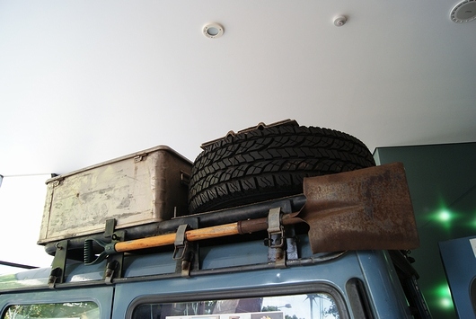 アフリカや南米、東南アジアなどでは道なき道を走るので、屋根の上にはスコップや予備のタイヤなどが積んであります。