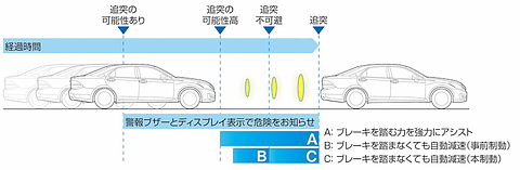 추돌 사고는 정지하고 있는 차량에 대해서 뿐만이 아니고, 급감속 한 선행차 등 이동 차량과의 사이에 발생하고 있어, 예를 들면 추돌 사고의 90%이상이, 전을 달리는 자동차와의 속도차이가 60 km/h이내에서 일어나고 있다.토요타는, 실제로 생기고 있는 추돌 사고의 데이터에 근거한 시스템 개발을 목표로 하고 있어 이번 시스템으로 업계 톱 레벨의 추돌 사고 저감 효과를 달성.덧붙여 신시스템은 많은 차종에의 탑재를 목표로 해 개발, 가까운 시일내에 발매하는 신형차로부터 차례차례 전개해 갈 예정으로 하고 있다.