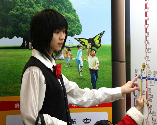 아이에게 해설하고 있도록(듯이) 도운 여고생.