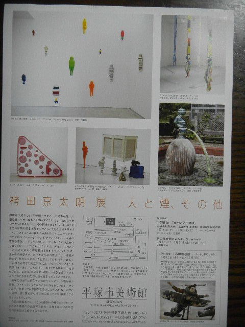 写真以下3枚。この時、平塚(hiratsuka)市美術館で行われていた、袴田 京太郎(hakamata kyotaro)の展覧会(exhibition)の、展示作品例。。。展覧会(exhibition)の、チラシ(leaflet)より。。。全て、袴田 京太郎(hakamata kyotaro)の作品です。袴田 京太郎(hakamata kyotaro)の展覧会(exhibition)は、今回、初めて見たのですが、中々、面白かったです(期待していたよりも、面白かった)。袴田 京太郎(hakamata kyotaro)(1963年生まれ)は、1980年代後期頃から活躍している、日本の、中堅所(中堅どころ)の、現代美術artist(彫刻家)です。