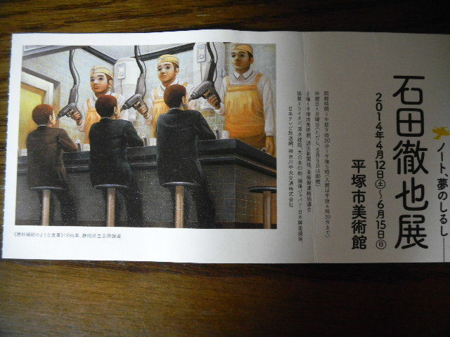 写真以下3枚。この時、平塚(hiratsuka)市美術館で行われていた、石田 徹也(ishida tetsuya)の、展覧会(exhibition)の、展示作品例。展覧会(exhibition)の、チラシ(leaflet)とチケット(ticket)より。。。何れも、石田 徹也(ishida tetsuya)の作品です。石田 徹也(ishida tetsuya)の展覧会(exhibition)も、この時、初めて見ました。石田 徹也(ishida tetsuya)の展覧会(exhibition)は、興味深い作品もあったのですが、全般的に、暗い雰囲気の作品が多く、見ていて、やや陰鬱な気分となりました。石田 徹也(ishida tetsuya)(1973年に生まれ)は、1990年代半ば頃より活躍し、2005年、31歳と言う若さで、列車の踏切(crossing)での事故により亡くなった(suicideによって亡くなったとも言われていますが、真相は、分かりません)、日本の、現代画家です(現代画家ですが、作風は、現代絵画としては、古典的な雰囲気を感じさせます)。