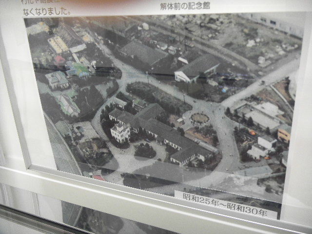 1950年から1955年頃、その、旧(かつての)日本海軍の火薬工場の敷地が、横浜ゴム(Yokohama Tire)に買収された頃の、その、旧(かつての)日本海軍の火薬工場の敷地の事務所関連の建物周辺(おそらく。。。)の写真(旧(かつての)横浜ゴム(Yokohama Tire)の、古い西洋式の建物の、展示より。。。)。写真左端に、以下の写真の建物である、旧(かつての)横浜ゴム(Yokohama Tire)の、古い西洋式の建物が写っています。前述の通り、その、旧(かつての)日本海軍の火薬工場は、第二次世界大戦末期(1945年)のアメリカ軍の空襲により、工場の敷地内の製造施設の建物は、ほとんど完璧に破壊されましたが、写真を見る限り、工場の事務所関連の建物(おそらく、写真の下半分の、大きな建物が、事務所)は、空襲(爆撃)により、破壊されないで、残った様です(横浜ゴム(Yokohama Tire)は、おそらく、これ等、旧(かつての)日本海軍の火薬工場の、事務所関連の建物は、しばらくの間(ある程度、長い間)、横浜ゴム(Yokohama Tire)の、平塚(hiratsuka)の工場の事務所の建物として、使用していたのではないでしょうか。。。)。第二次世界大戦後、間も無くから、1950年代初め頃まで、アメリカ軍は、日本の、都市部(特に、東京圏)を中心に、非常に多くの建物を接収していましたが、アメリカ軍は、日本国内の建物に関する詳細な情報を入手し、第二次世界大戦において、日本の空襲を計画するに当たって、日本の敗戦後、接収して使えそうな建物は、空襲(爆撃)の標的から外したと言う話を聞いた事があります(さすが、アメリカ。。。余裕と言うか、恐ろしいと言うか。。。)。もしかしたら、それにより、アメリカ軍は、空爆により、その、旧(かつての)日本海軍の火薬工場の、製造施設の建物は、ほとんど完璧に破壊したものの(アメリカを倒す為の兵器(火薬)を製造する設備なのだから、当然。。。)、事務所関連の建物は、破壊しないで、残したのかもしれません(実際、当時の、爆撃の精度が、そこまで高かったのかどうか分からないですし、私は、その様な、軍事関連の知識はないので、間違っていたら申し訳ありませんが。。。)。ちなみに、前述の通り、アメリカ軍は、第二次世界大戦後、間も無く、日本の、都市部(特に、東京圏)を中心に、非常に多くの建物を接収しましたが、1952年に、連合国軍最高司令官総司令部(Supreme Commander of the Allied Powers)(下の補足説明参照)が、活動を停止した事等に伴い、1950年代初め頃までに、ほとんどの接収を解除しました。