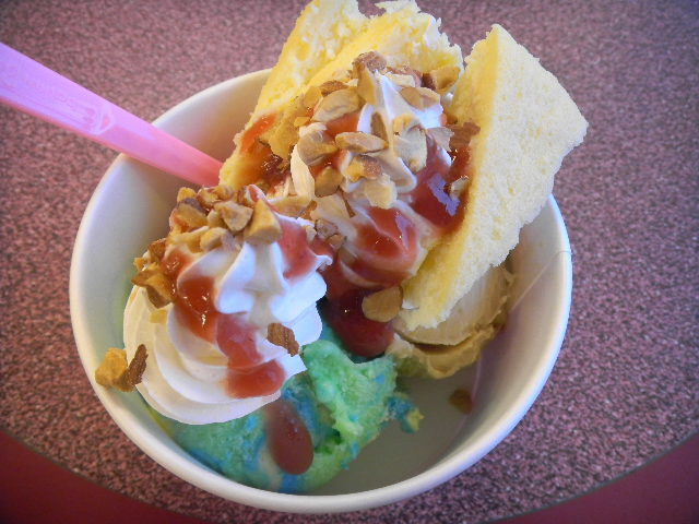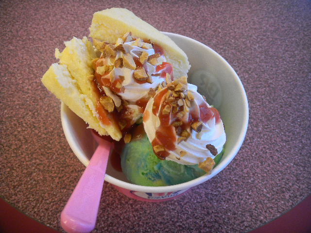 写真以下3枚。この時、私が食べた物。チーズケーキ(cheesecake)と、2種類の、アイスクリーム(ice cream)の組み合わせ。ブラジルの国旗をイメージした、三色のシャーベット(sorbet)(キーウィ(kiwifruit)、レモン(lemon)、ブルーラズベリー(blue raspberry))。アールグレイ(Earl Grey)紅茶風味のアイスクリーム(ice cream)に、キャラメル(caramel)のソース(sauce)と、スコーン(scone)が入った、アイスクリーム(ice cream)(美味しいです)。
