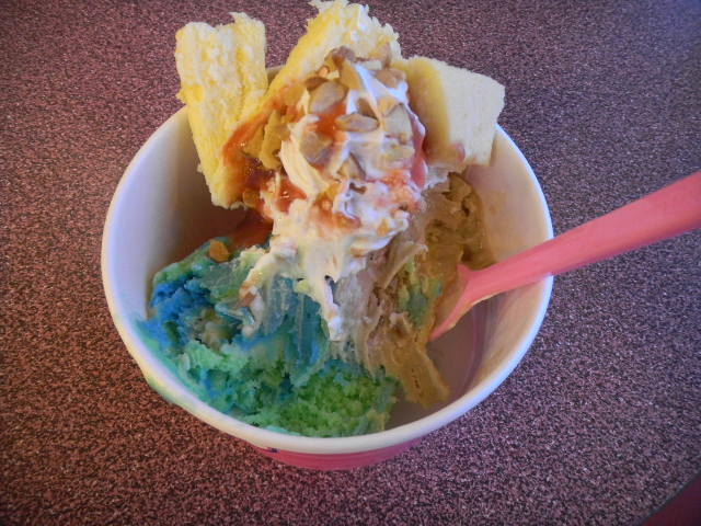 奥は、(食べている途中に撮影した物ですが)、この時、彼女が食べた物で、3種類の、小さな、アイスクリーム(ice cream)の組み合わせ。ココナッツ(coconut)のアイスクリーム(ice cream)に、パイナップル(pineapple)のシャーベット(sorbet)、パッションフルーツ(passion fruit)のシャーベット(sorbet)、ココナッツ(coconut)風味のカシューナッツ(cashew nut)を加えた、アイスクリーム(ice cream)(このアイスクリーム(ice cream)は、美味しいです)。ブラジルの国旗をイメージした、三色のシャーベット(sorbet)(この時、調度、ブラジルの、ワールドカップ(2014 FIFA World Cup)が始まる直前でした)。コーヒー(coffee)のアイスクリーム(ice cream)に、アーモンド(almond)、チョコレートが、加わった、アイスクリーム(ice cream)。手前は、この時、私が食べた物。