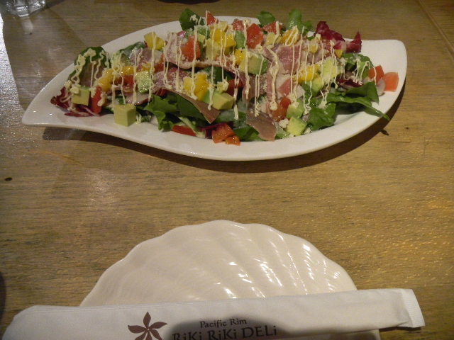 写真以下2枚。サラダ(salad)。マンゴー(mango)、アボカド(avocado)、生ハム(ham)に、パイナップル(pineapple)とココナッツ(coconut)等のドレッシング(dressing)を合わせた、野菜サラダ(salad)。