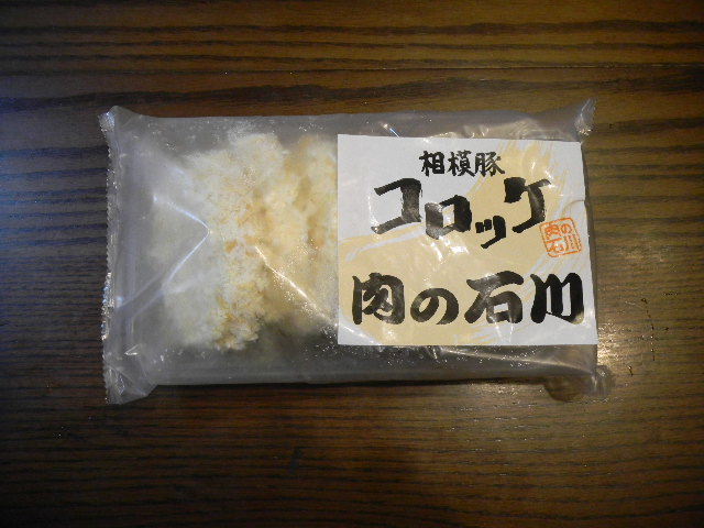 湘南(syonan)の、平塚(hiratsuka)の肉店・肉会社の、相模(sagami)豚(神奈川(kanagawa)県(下の補足説明参照)産の高品質な豚肉)の豚肉と、ジャガイモ(potato)の、コロッケ。我が家で食べる、夕食用。
