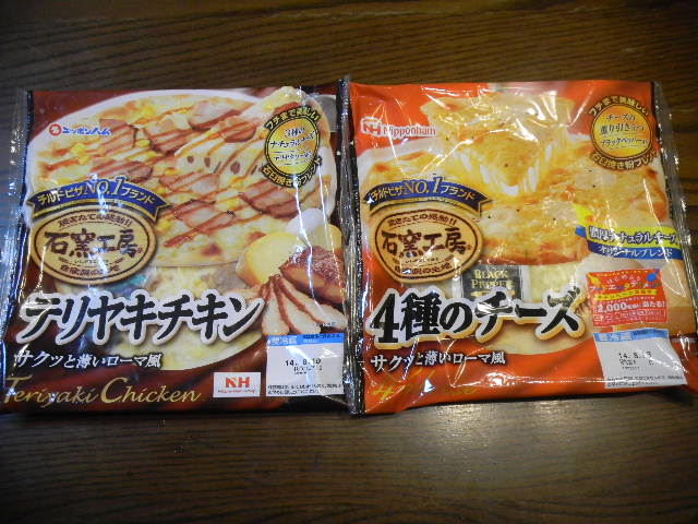 自宅に持ち込んだ仕事を、夜、遅くまでしている時の夜食として、よく食べている、マートの、非常にチープな(とても、安い)、ピザ(pizza)。ただし、(写真右側の、4種類のチーズ(cheese)のピザ(pizza)は、夜食として、よく食べていますが)、写真左側の、テリヤキ(teriyaki)チキン(chicken)のピザ(pizza)は、初めて食べましたが、不味かったです(もう、2度と買わなくていいかな。。。)。