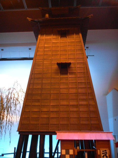 火の見櫓。以下、火の見櫓の説明は、江戸(edo)深川(fukagawa)資料館の説明を参考にしました。町を火事から守る為の建物で、最上階には、鐘が吊るされており、火事を見つけると、番人が、金を鳴らして、町に知らせます。