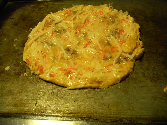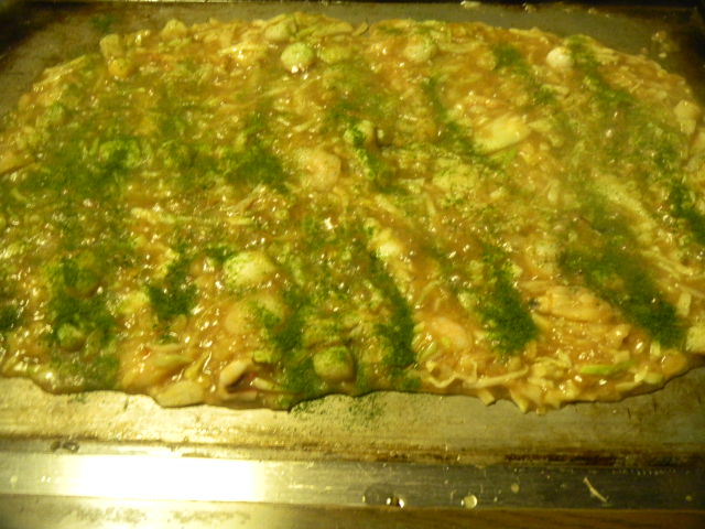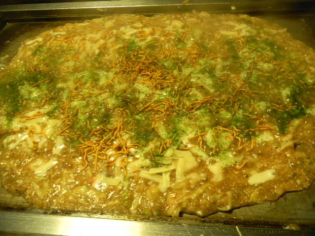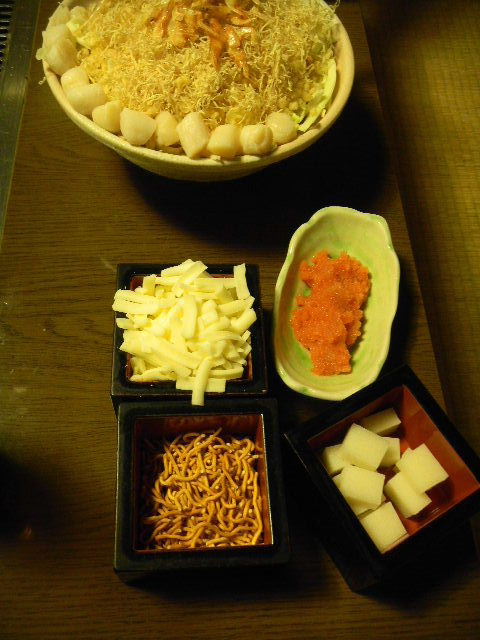 写真以下2枚。チーズ(cheese)、明太子(唐辛子を使用して味を付けた、鱈の卵。日本で、よく食べられていますが、韓国から来た食べ物かな。。。)、ベビースター(ラーメンをイメージした、スナック(snack)菓子。代表的な、駄菓子(dagashi)の一つ)、餅、イカ(烏賊)の、大きなサイズ(size)の、もんじゃ焼き(monjyayaki)。