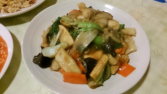 ふくろ茸とカシューナッツ、茄子、人参、クワイ、ピーマン、銀杏が入った