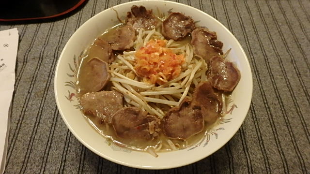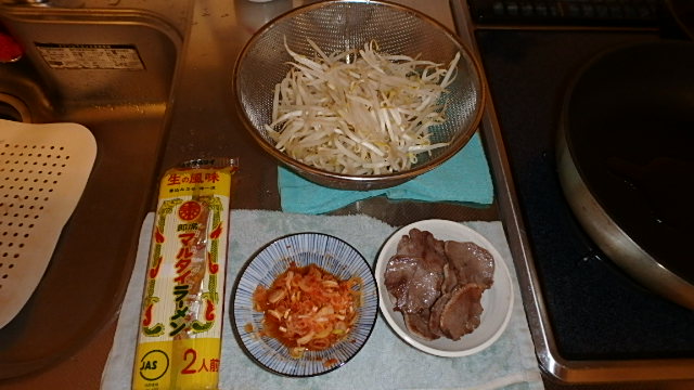 辛ネギ、豚のタン、モヤシとマルタイのラーメンで・・・