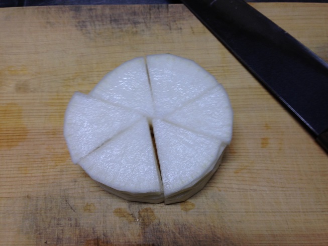 大根は、適当な厚さに切って、銀杏切りにしましょう。