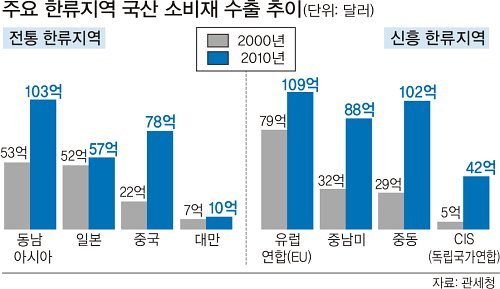 • 한류(韓流)가 수출 역군의 역할을 톡톡히 해내고 있다. 기존의 한류 전파지역인 일본과 중국, 동남아시아 외에 중동과 중남미, 유럽연합(EU) 등이 2005년 이후 신흥 한류지역으로 떠올라 이들 국가로의 소비재 수출이 급증세를 보이고 있다. 특히 2000년대 초반 드라마를 중심으로 한 초기 한류에 이어 2008년 이후 ‘K팝(POP)’으로 불리는 한국 대중가요의 열풍 등 신(新)한류에 힘입어 화장품, 액세서리여성의류, 휴대전화 등이 유망 수출품목으로 자리매김하고 있다.