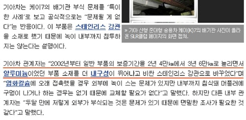 문제는KIA회사에서 말한대로Stainless가 염화칼슘과 만나면stain이 만들어지는가 나는 그 것이 알고 싶을 뿐이다.아무리 일반의 상식으로도 전혀 이해가 가지 않는다.어떻게Stainless에 녹이 생길 수 있는가?진짜로 저게Stainless로 만든 겁니까?제아무리Stainless라도 저렇게 염화칼슘과 만나면 부셔집니까?
