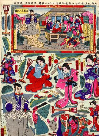 立版古(tatebanko)とは、江戸時代後期から明治期にかけて流行ったおもちゃ絵の一種で、一枚の絵柄からたくさんのパーツを切り抜き、設計図にそって組み立て、紙製のジオラマを完成させて楽しむものである。「組上げ灯籠」「組上げ絵」などともいう。歌舞伎の名場面などに題材を取るものが多かった。制作者は絵の才能¥と同時に、限られたの紙面にうまくパーツを配する技術も要求された。 おもちゃ絵の中では歴史があり、江戸時代中期にはすでに制作されていた。江戸時代後期には葛飾北斎らも制作に当たった。明治時代中期に流行したのちは廃れ、大正時代以降はあまり見かけられなくなった。 Wikipediaより 元来は夏の盆の頃、夕涼みにあわせて軒先に飾り、灯籠のように火で照らして道行く人々に見せていたようです。