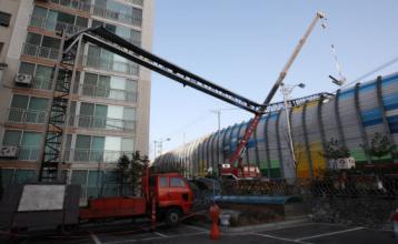 22日午後1時15分ごろ、仁川市富平区十井洞のトゥランチェ・マンションで、引越し荷物を運んでいた高層用はしご車のはしごが転倒し、首都圏電鉄1号線の線路の上に覆いかぶさる事故が発生した。この事故により電気の供給が途絶え、電車の運行が3時間にわたって中断した。/写真=キム・ヨングク記者