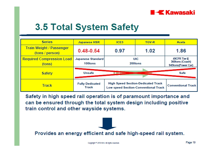 카와사키가 미국에서 신칸센 프레젠테이션에서 공개한 슬라이드의 일부로서, 일본의 충돌 안전강도 기준이 100톤으로, 미국의 360톤, UIC(유럽)의 200톤보다 지극히 낮아도, 일본식 전용철로에서만 운용하면 안전하기 때문에 미국정부에 철도차량의 충돌 안전강도 요구사항을 삭제하라고 요구하고 있습니다.