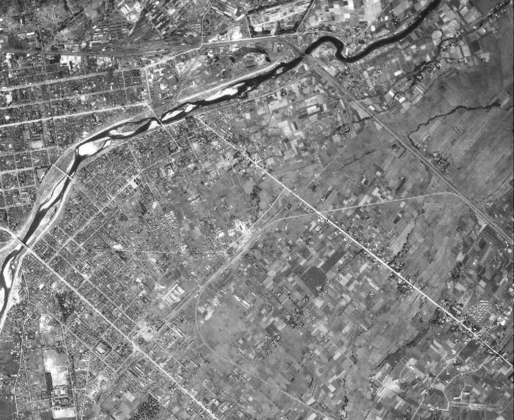 촬영은 1947년 9월 10일입니다.좌상에 역이 보이네요.수평에 선로가 성장해 강의 곁에서, 우하에 꺽여져, 곧바로 선로가 성장하고 있습니다.