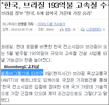 어디에도 한국 미디어를 인용하고 있다고 말하는 부분은 없다. 기자의 이름도 한국인처럼 보이지는 않네요.