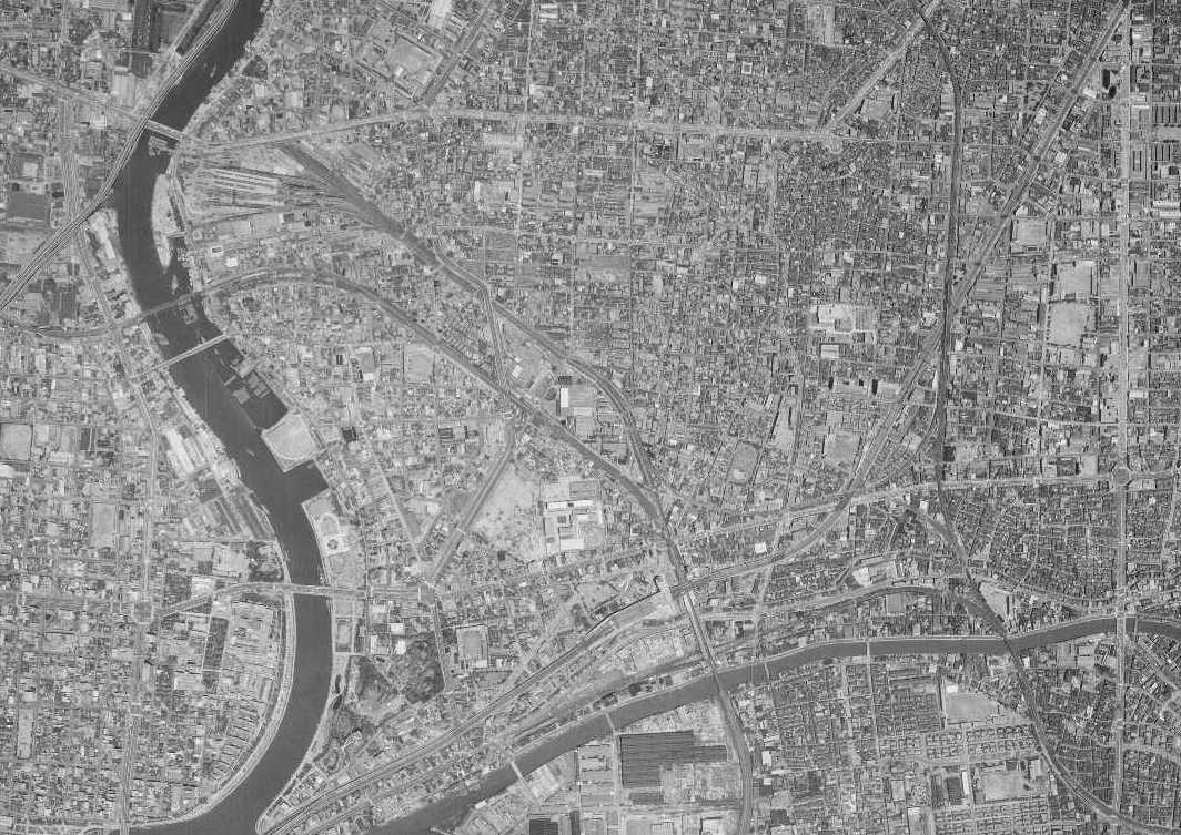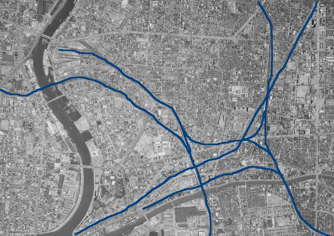 左側に大きな川が流れています。S字に曲がる窪みに終着駅がありますね。