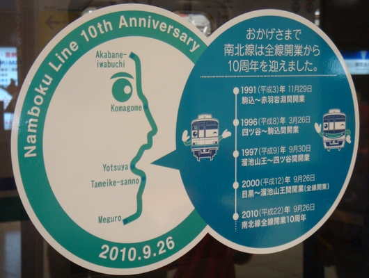 난보쿠선 각 역의 홈 도어에 붙인 것이라고 전선 개통 10주년 기념 스티커.