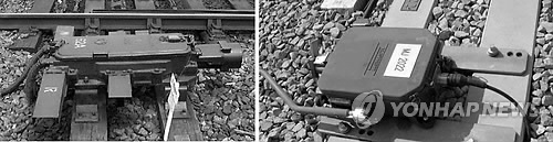 (大田(テジョン)コレイル=聯合ニュース)ユンソクが記者=全国コレイル鉄道に設置された分期期の姿.左側が“NS型”,右側が“MJ81型”線路転換期の姿.2011.3.6