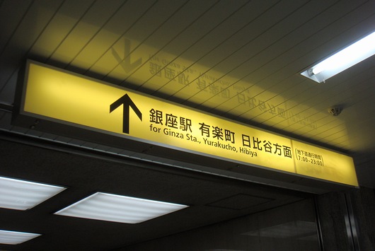 中央改札口の向かい側、「東銀座駅」の三原橋方面改札口に来ると、このように「↑銀座駅 有楽町 日比谷方面」と書かれた案内があるので、直進します。