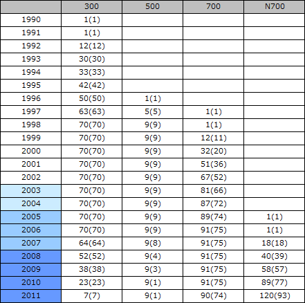 2011년 12월 23 일시점의 편성수.괄호안은 16 양편성의 갯수.영업 운전에 붙어 있지 않은 500계 W1편성과 N700계 Z0편성도 포함한다.