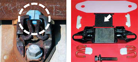 絶縁ブロックが壊れた特殊部品の締結部。全体の90%程度が基準と異なる方法で設置されていた。締結装置を分解した右の写真で、四角形の黒い部品(矢印表示)が弾性パッド。開通から1年もたたない時点で、衝撃を吸収する力が失われていたことが分かった。