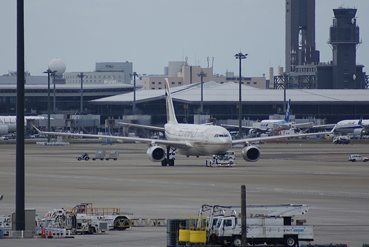 到着し、いったんターミナルから離れる機材ですね。折り返しの便名はEY877でもEY879でもなく、EY871なのが興味深いです。エティハド航空はUAEの航空会社で、日本のANAと提携しています。日本には成田国際空港の他、中部国際空港へも乗り入れています。なお、同じUAEのエミレーツ航空はJALと提携しています。