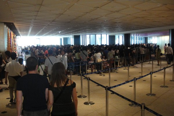 開業当初は事前予約でないと登れなかったのが、最近当日券も売るようになったと聞いて寄ってみたけど、窓口の前には長蛇の列がウネウネ。建物の外にまではみ出して、なおウネウネしていましたよ。
