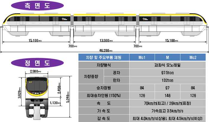모노레일차량 28개84량 편성중에 최초 시작1개 편성만 일본 히타치제작소에서 제작 완료