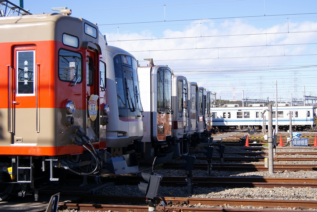 차량 전시를 위해 줄선 토부의 통근 전철들.스페이시아용의 100계나, 료 이제(벌써) 용무의 200계·250계등을 안는 이세사키선계통과 달리, 토오조센 계통에는 통근형 차량 밖에 없습니다.그런 토부 토오조센의 통근 전철도, 디지털 ATC화를 예정하고 있는 것으로부터, 근대적인 스텐레스 차량이나 알루미늄 차량만이 되었습니다.